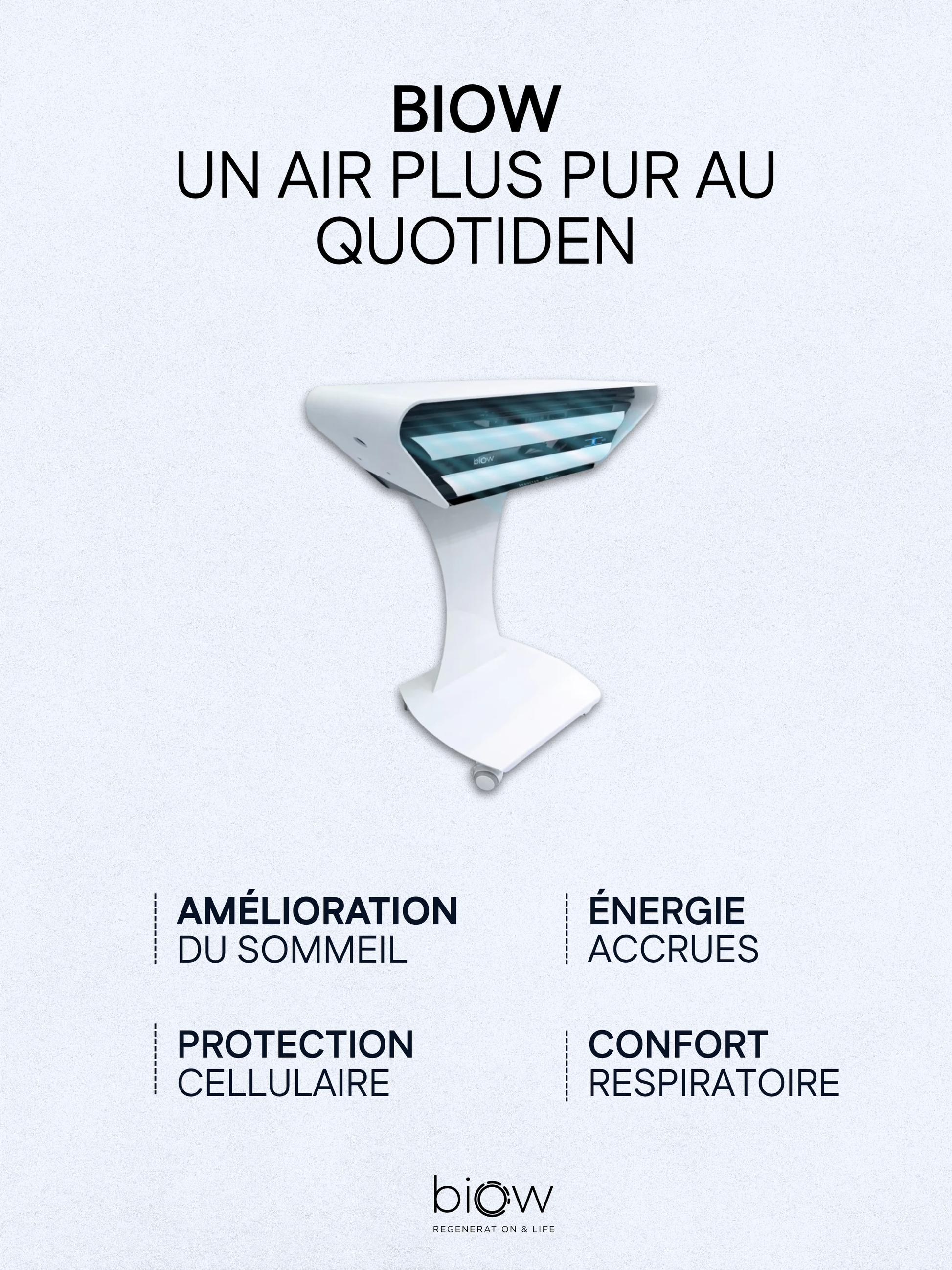 Découvrez BIOW, le système de régénération cellulaire qui transforme votre espace de vie pour améliorer votre respiration, votre sommeil et votre vitalité, en réduisant le stress oxydatif grâce à un environnement ionique unique.