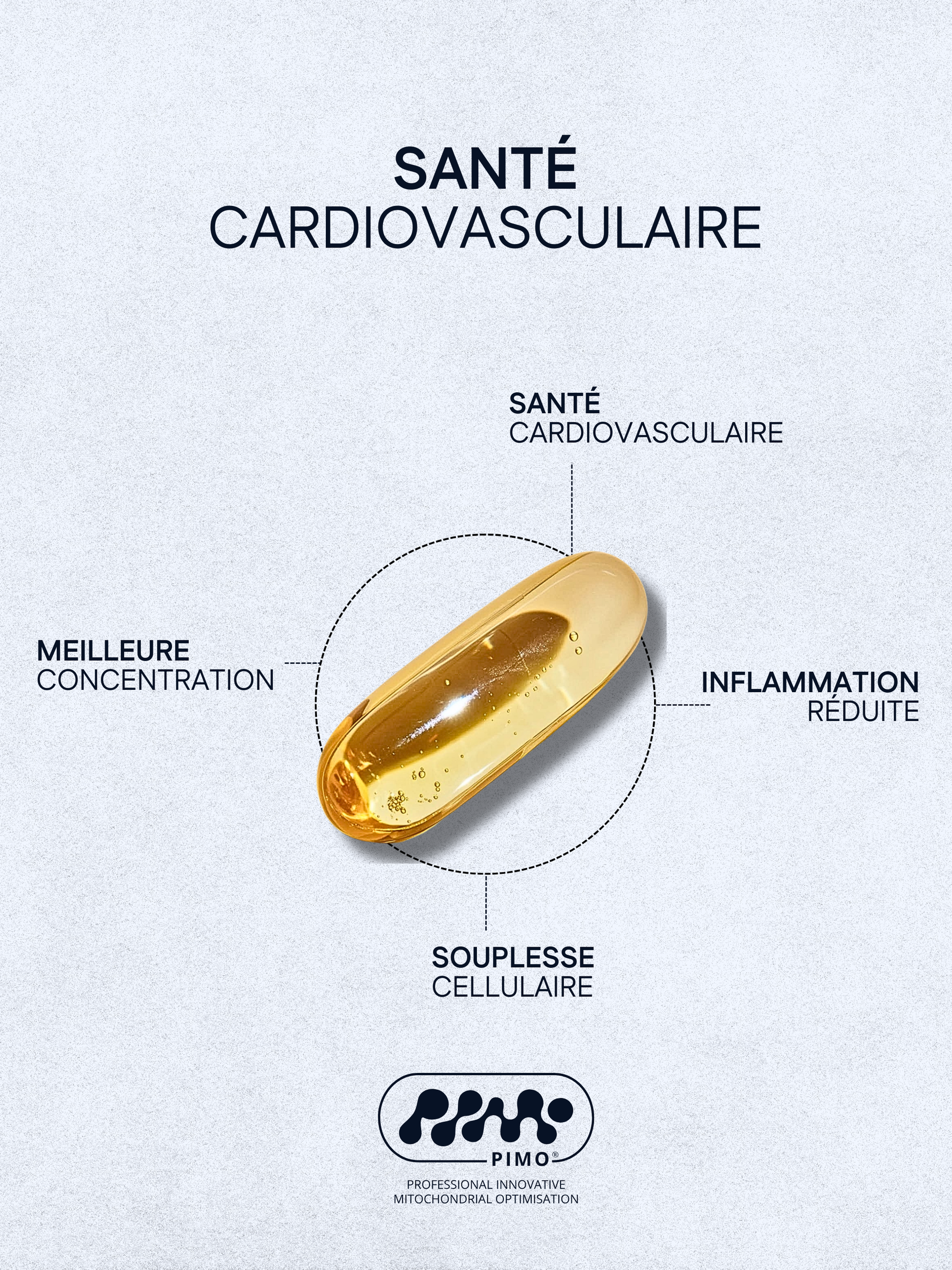 MitoMeg3 soutient activement la santé cardiovasculaire en favorisant une fonction cardiaque et une pression sanguine normales. Sa richesse en DHA nourrit le cerveau et stimule les fonctions cognitives comme la mémoire et la concentration. Il améliore la fluidité des membranes mitochondriales afin d’optimiser la production d’énergie (ATP) et la performance cellulaire, tout en aidant à réguler l’inflammation pour protéger durablement vos cellules et vos tissus.