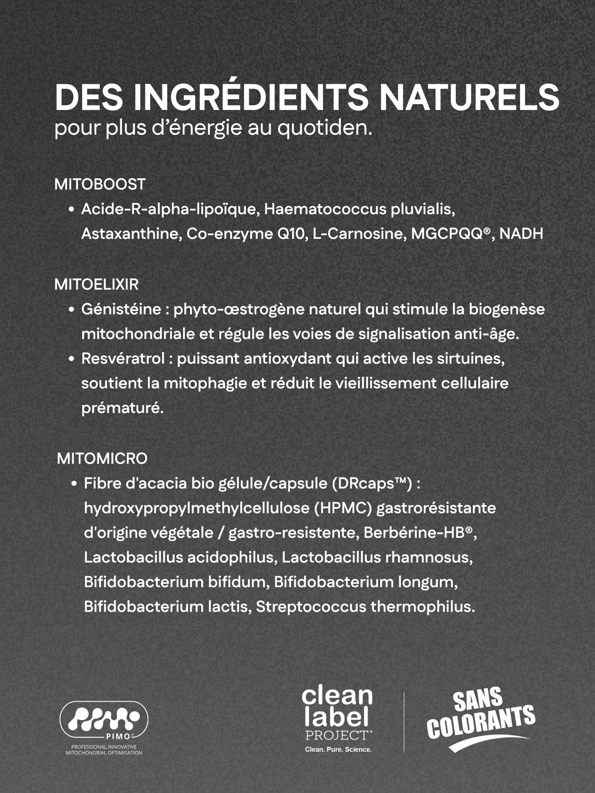 Le Pack RGNR Booster — Énergie et tonus au quotidien associe Mitomicro, MitoBoost et MitoElixir pour soutenir une vitalité durable du matin au soir. Mitomicro contribue à l’équilibre du microbiote, point de départ d’un métabolisme efficace. MitoBoost apporte des cofacteurs essentiels (PQQ, CoQ10, R-ALA, NADH…) afin d’optimiser la production d’ATP et la performance des mitochondries. MitoElixir complète l’action en favorisant la biogenèse et la mitophagie, tout en offrant une protection antioxydante ciblée. Ensemble, ils aident à réduire la fatigue passagère, à améliorer le tonus et à maintenir une énergie stable tout au long de la journée.