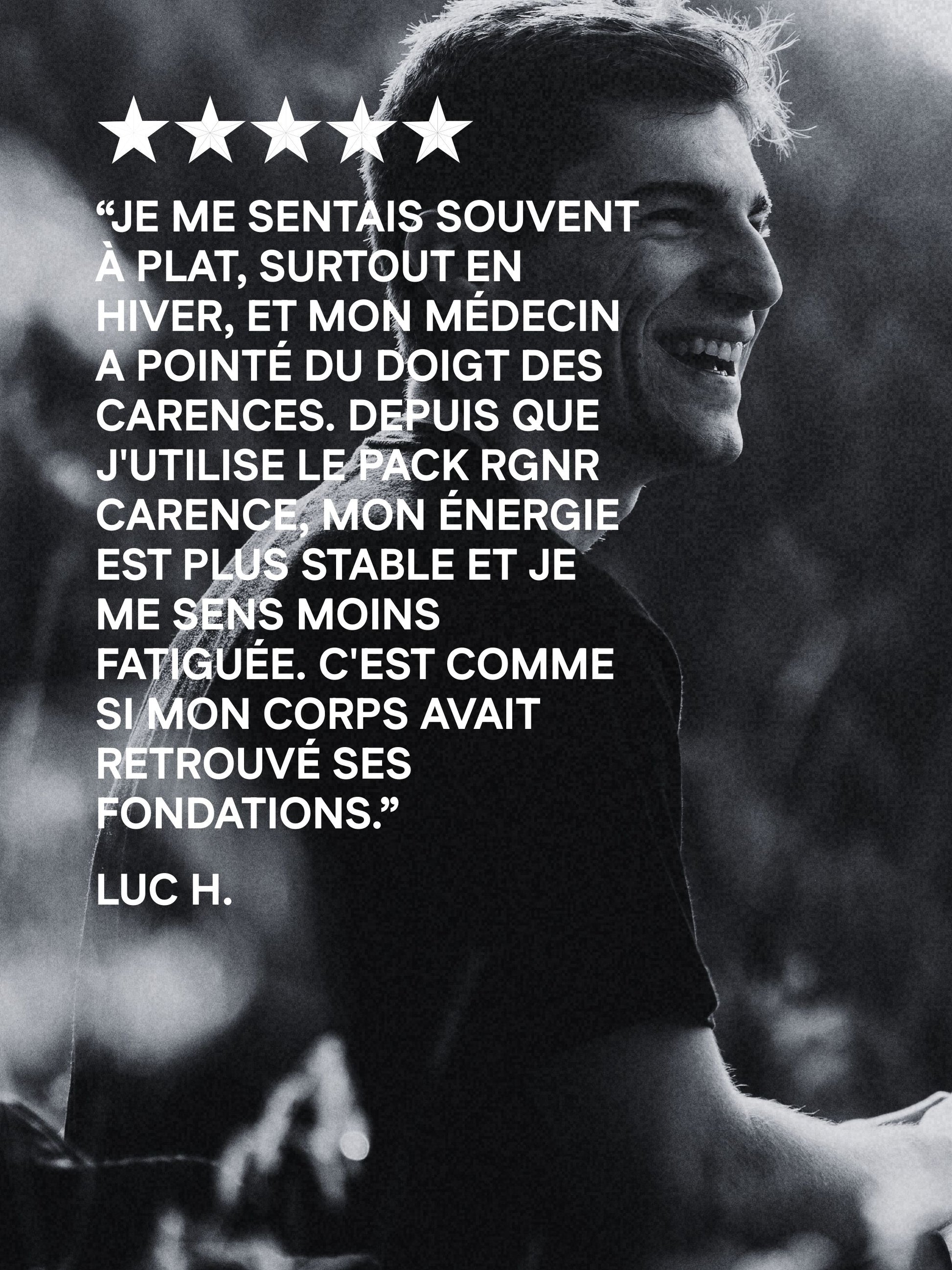 Le Pack RGNR Carence — Compense les déficits cible en priorité deux manques fréquents qui impactent l’énergie et la santé mitochondriale : les oméga-3 (EPA/DHA) et la vitamine D3. Composé de MitoMeg3 (apport concentré en oméga-3 longs) et de MitoD3 (vitamine D3 aux apports journaliers adaptés), il aide à optimiser la performance énergétique des cellules, à soutenir le système immunitaire et à favoriser un métabolisme équilibré. En rétablissant ces fondations nutritionnelles essentielles, le pack contribue à une énergie plus stable, au bien-être cardiovasculaire et à une meilleure résilience globale. Conseils d’utilisation : se référer aux pages produits MitoD3 et MitoMeg3 pour plus de détails.
